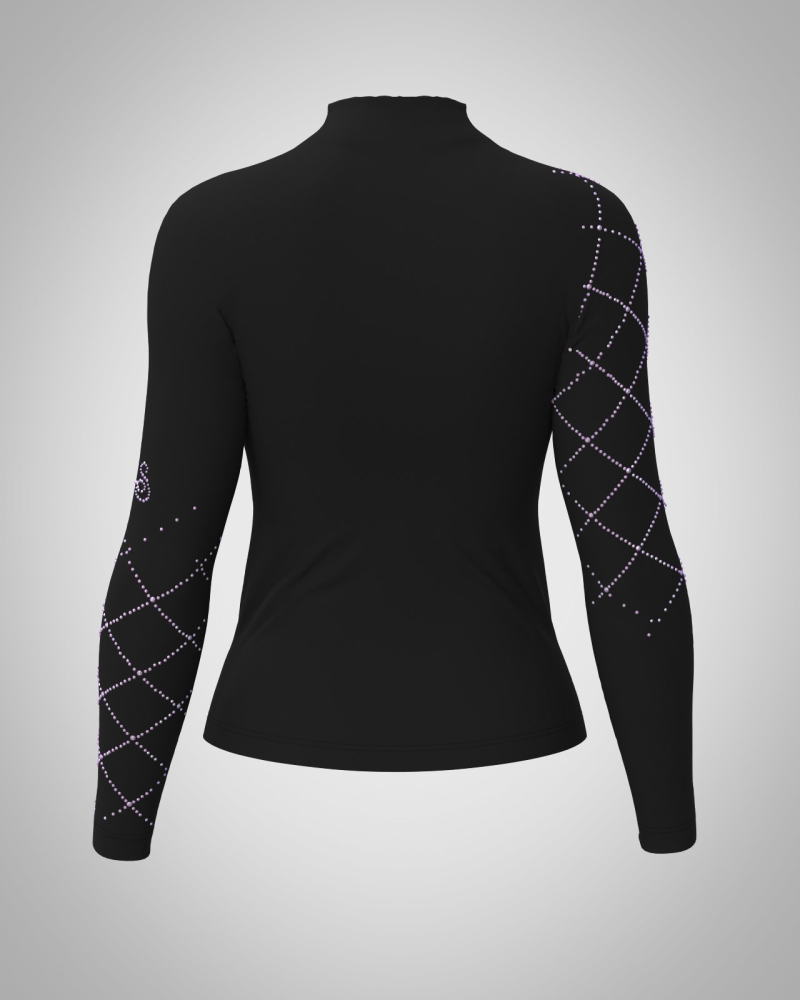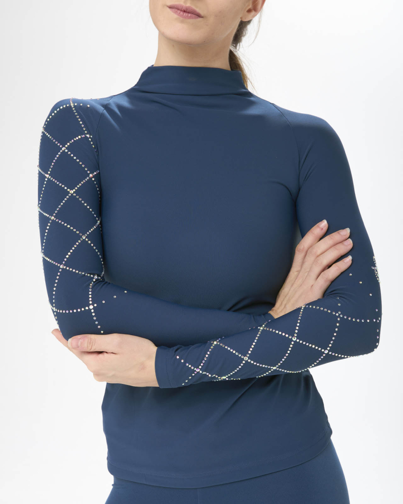 Long-sleeve T-shirt made from soft microfibre, a slightly brushed techno fabric on the inside with a micro peach-skin effect that makes it incredibly soft to the touch and gives the sensation of wearing a second skin. It dries quickly and wraps the body, following the athletic movement and shapes without constricting. The high crater neckline, with its deep curve gently opening towards the shoulders, adds an elegant and refined character. It is enhanced with a diamond-shaped pattern of aurora borealis crystals on the sleeves, sparkling and incredibly eye-catching, making it perfect for standing out on the rink.
