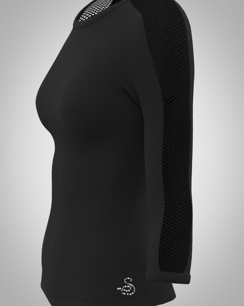 Comfortable T-shirt with three-quarter sleeves handcrafted in excellent black microfibre. The stretchy fabric with internal micro brushing is exceptionally soft, perfect to wrap around the body like a second skin and to keep it warm with an excellent fit, ensuring high breathability and easy care of the garment. It is suitable for ice and roller skating and for any sporting performance and leisure time thanks to the slim fit that follows the athletic movements without restriction. A simple but very elegant style thanks to the glittery mesh insert on the shoulders and along the entire sleeve which enhances the essential design of the garment.
